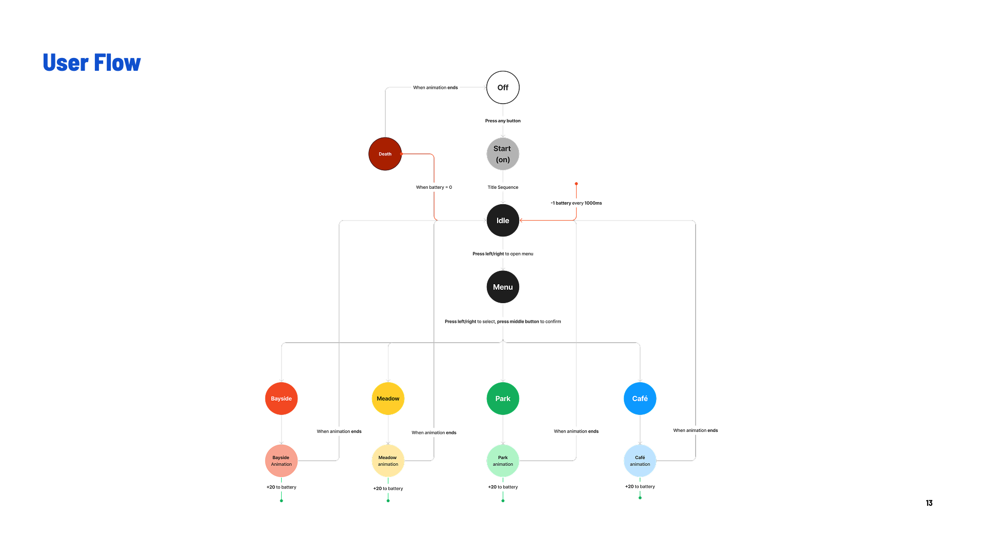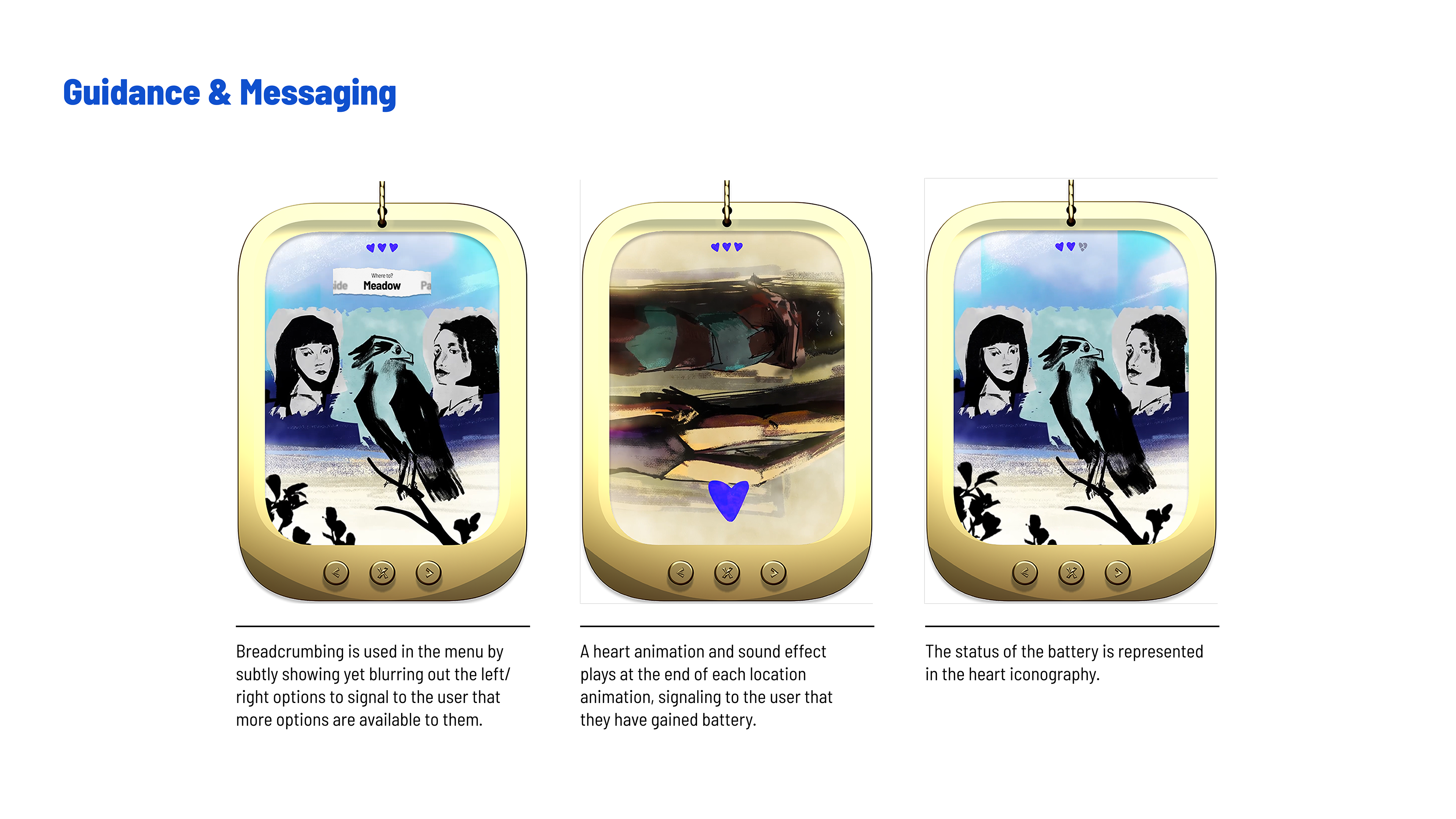 In the Tamagotchi form factor, there are only 3 physical buttons to engage the digital screen. As such, the user interface's visual elements have to help guide the user to ensure they can easily navigate the space.